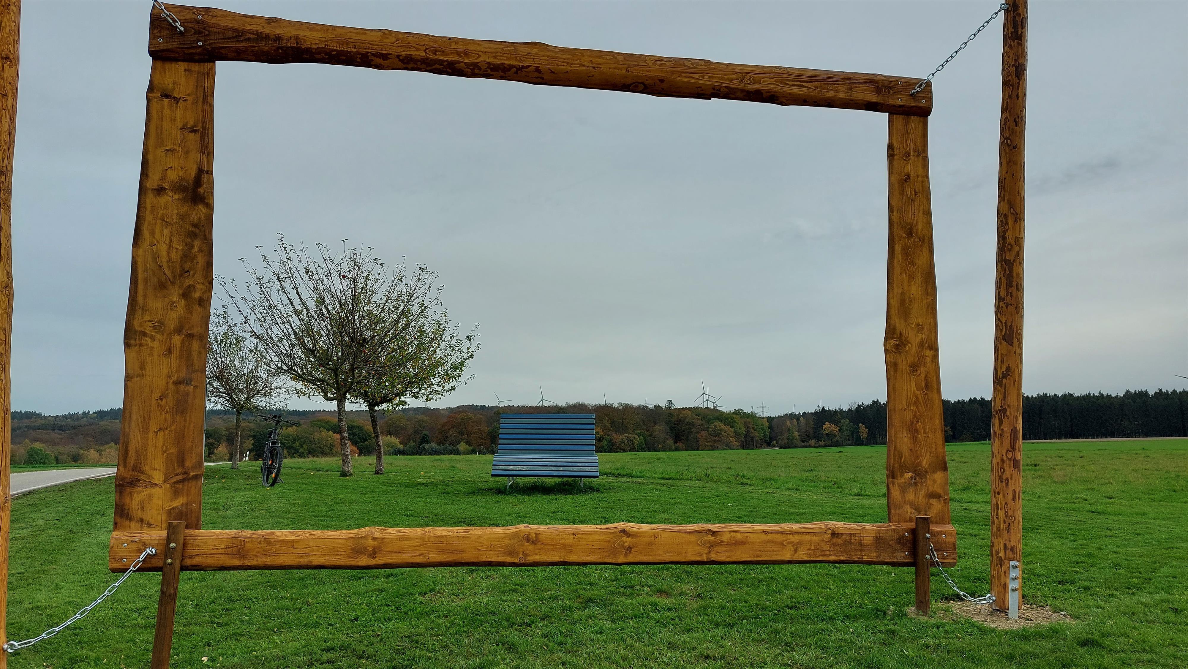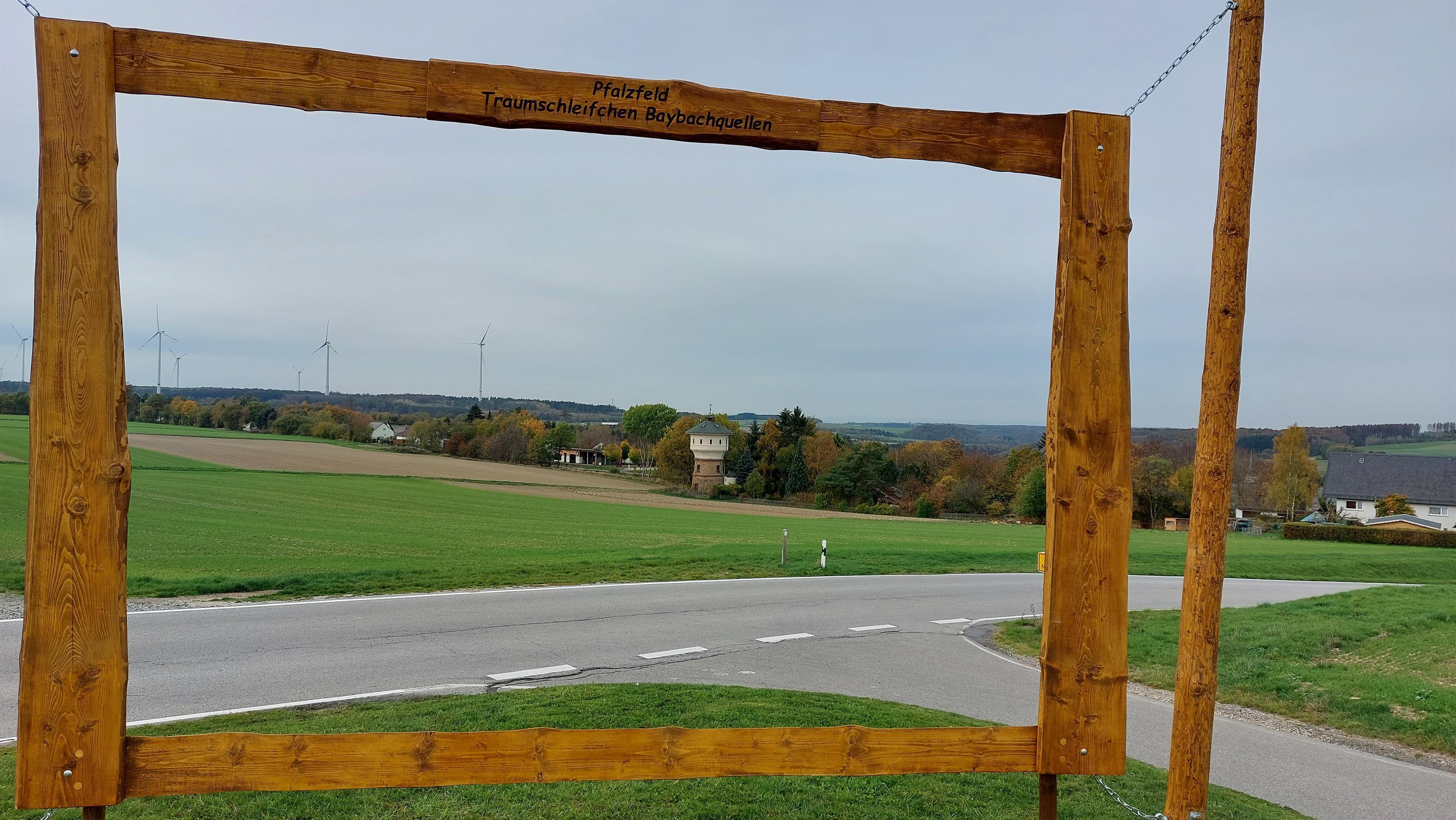 Schöne Aussicht auf den Pfalzfelder Wasserturm und Bahnhof am Traumschleifchen "Baybachquellen".