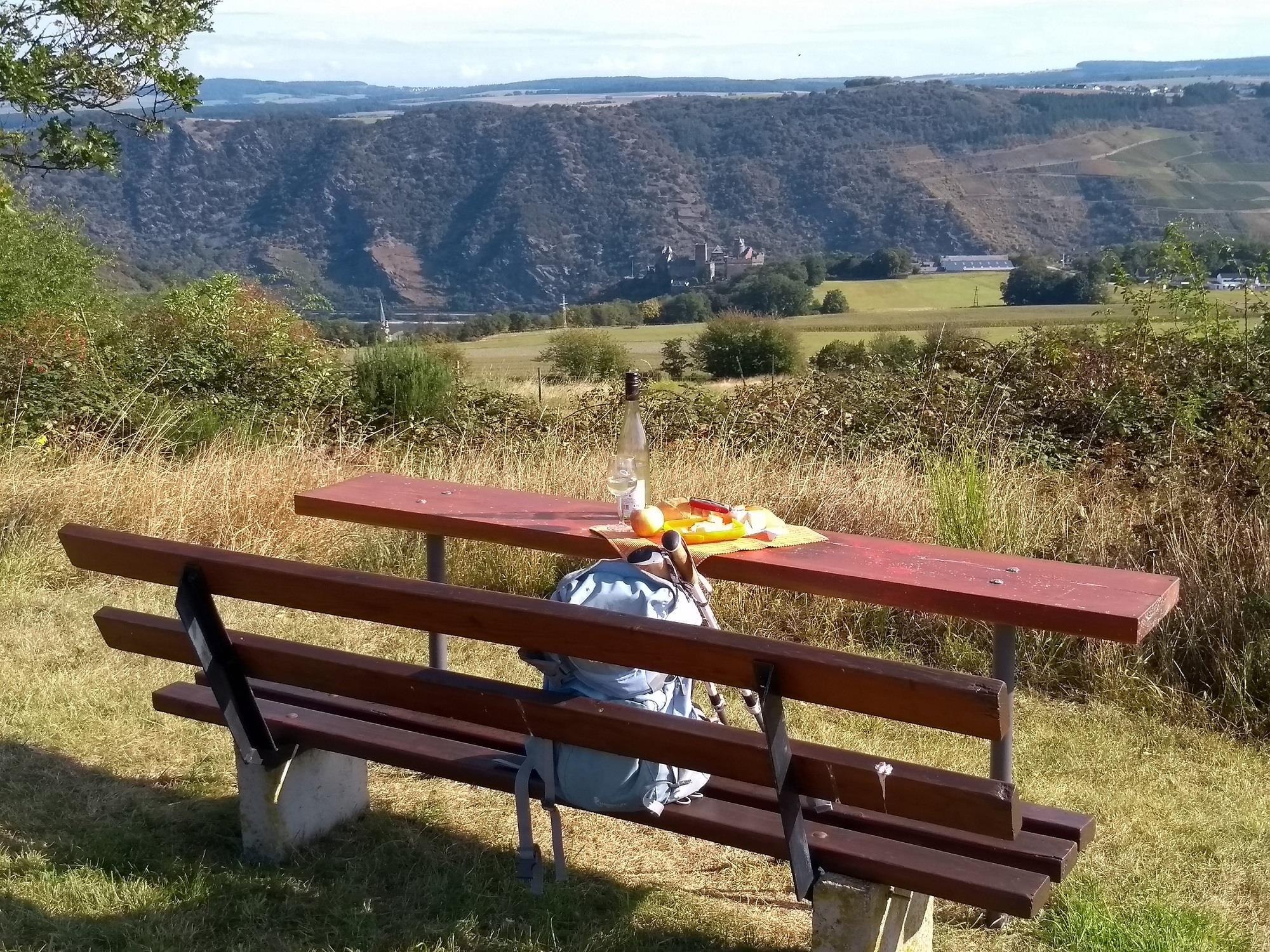 Picknickbank mit Schönburgblick am Wanderweg "Rund um Dellwe"