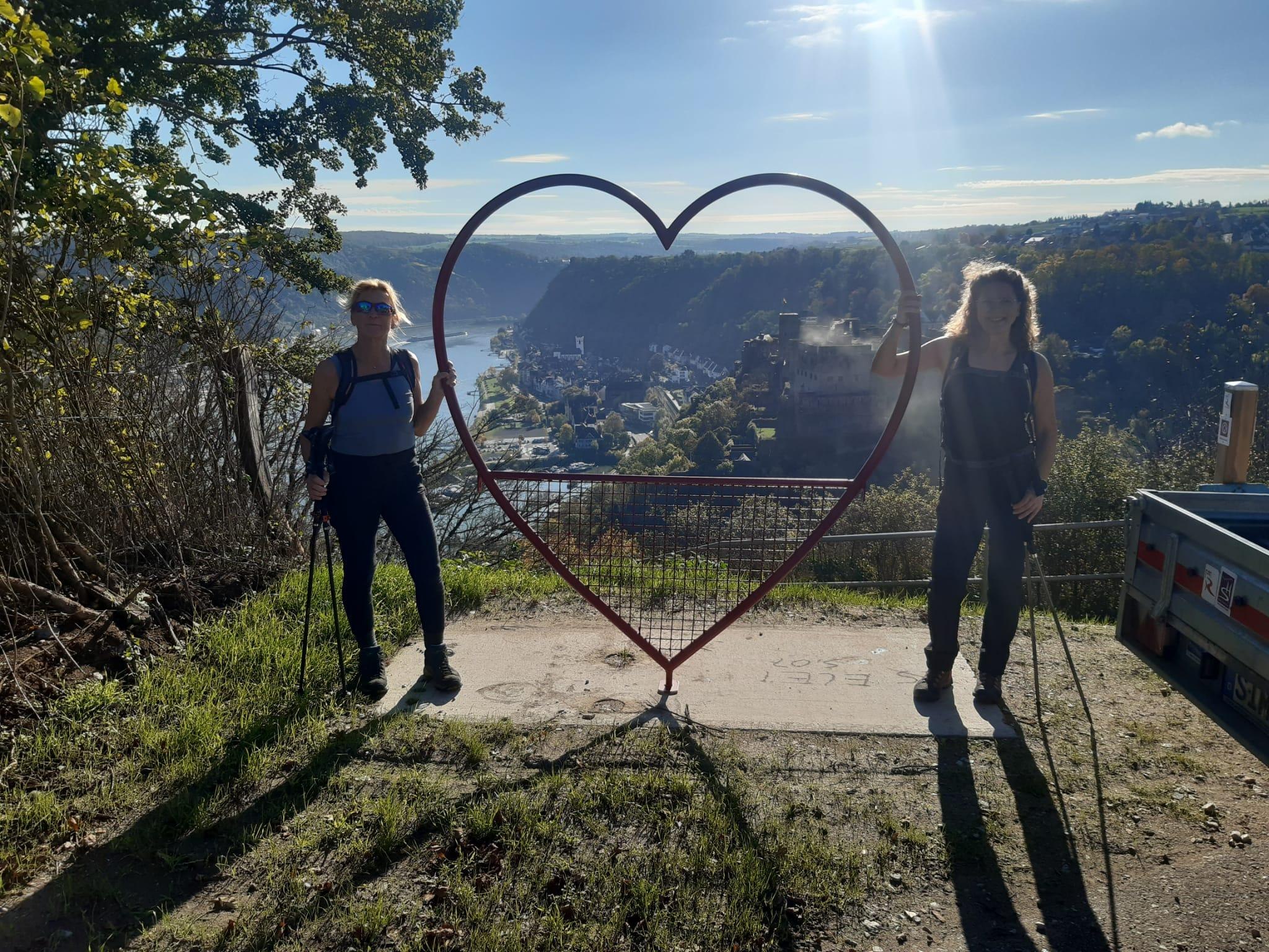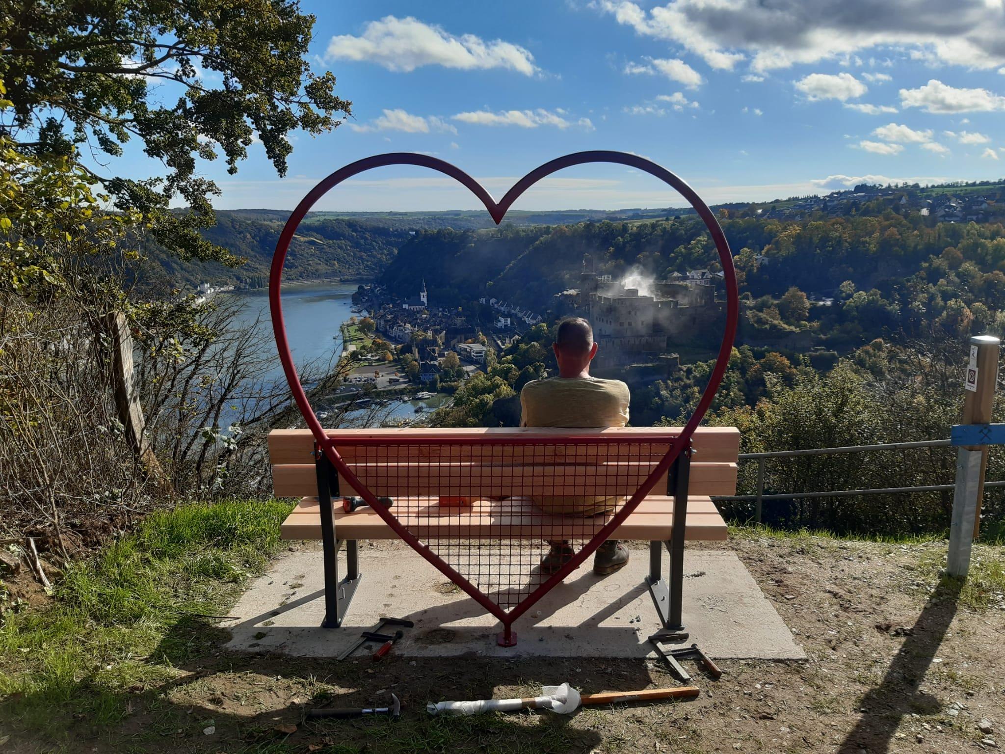 Ruhebank "Rheinfels-Herz" mit traumhaftem Blick auf den Mittelrhein mit der Burg Rheinfels.