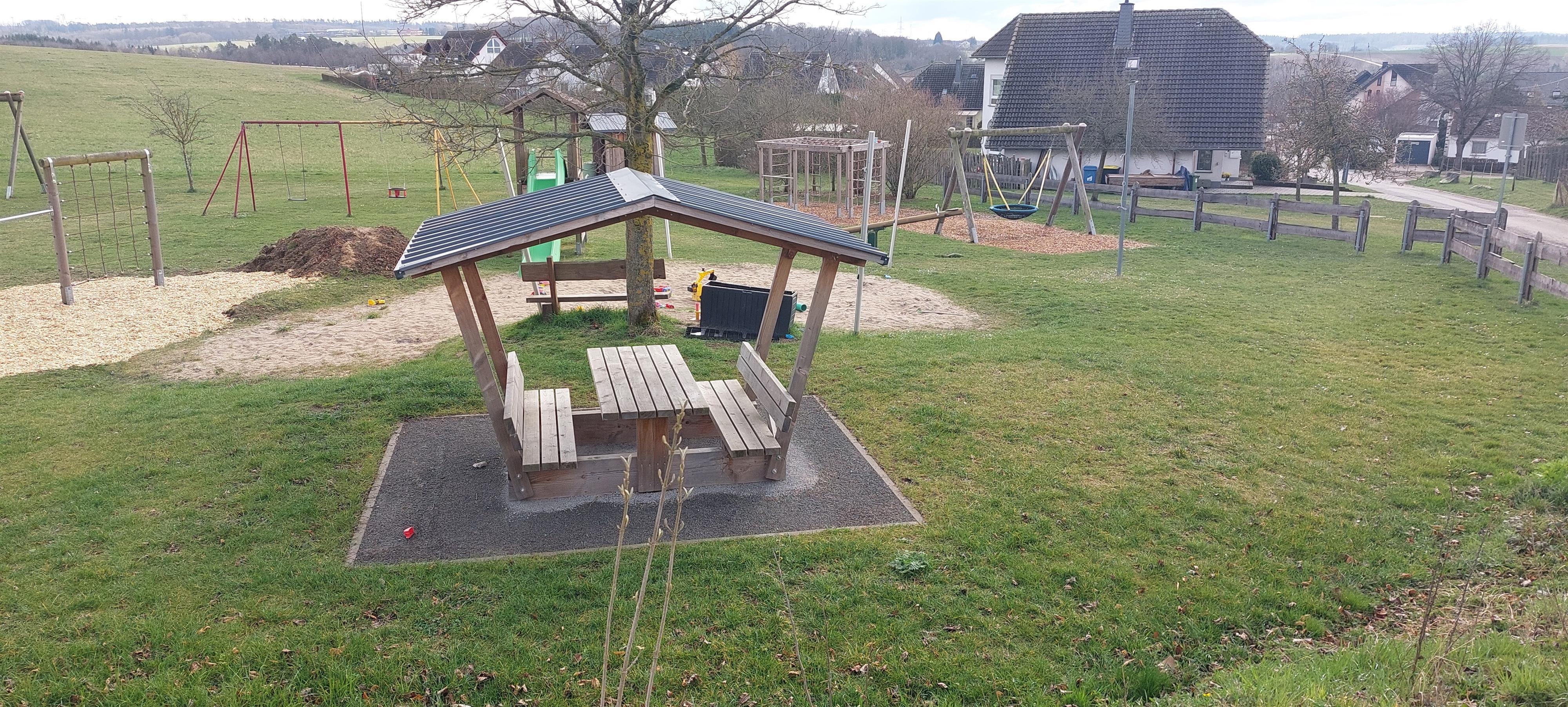 Schöner, ruhig gelegener Kinderspielplatz am Marktweg mit Rutsche, Schaukel und Picknickbank.