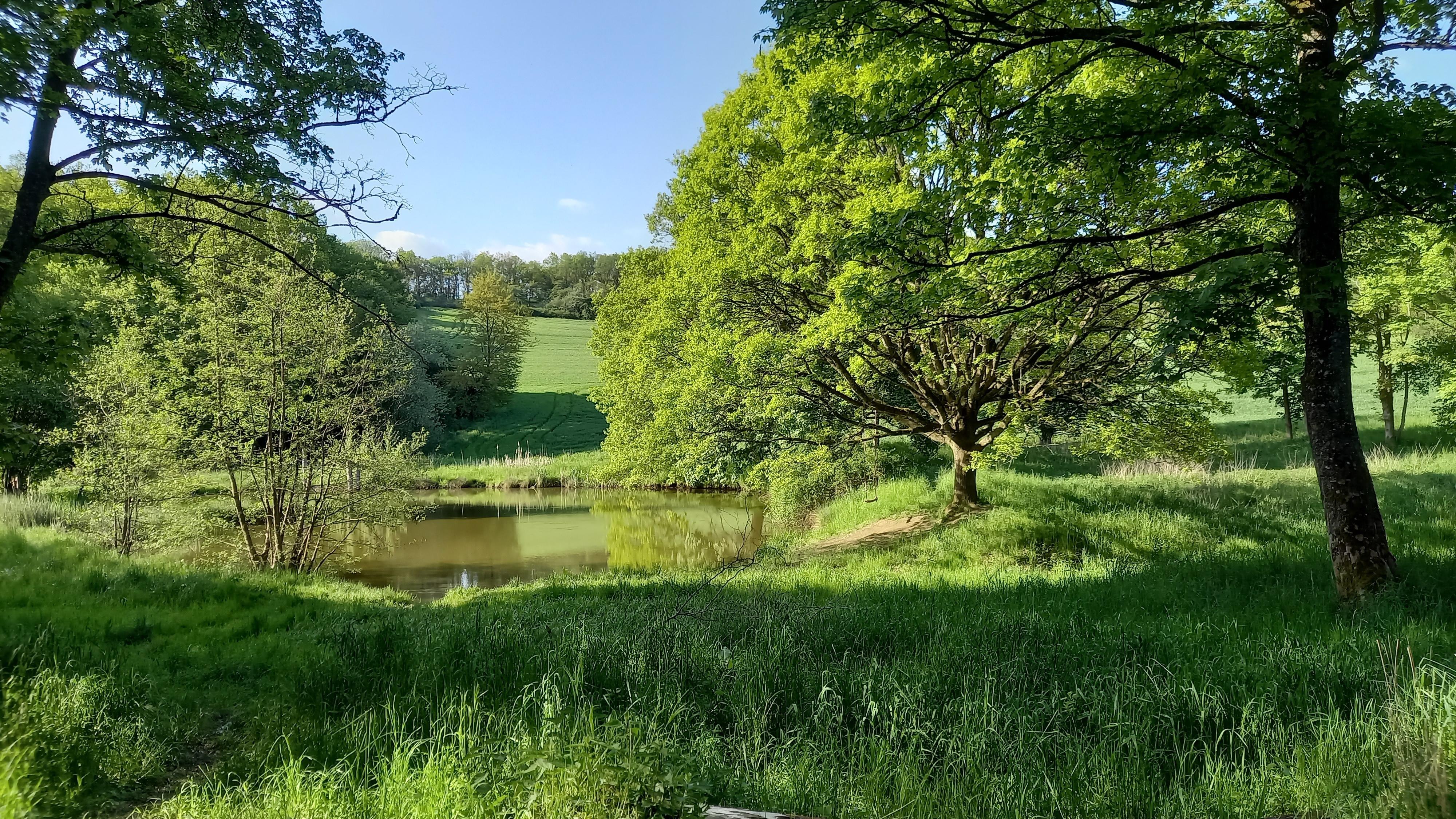 Wunderschöner, ruhiger Ort mit Ruhebank und Blick auf die Teiche am Liesenfelder Bachtal.