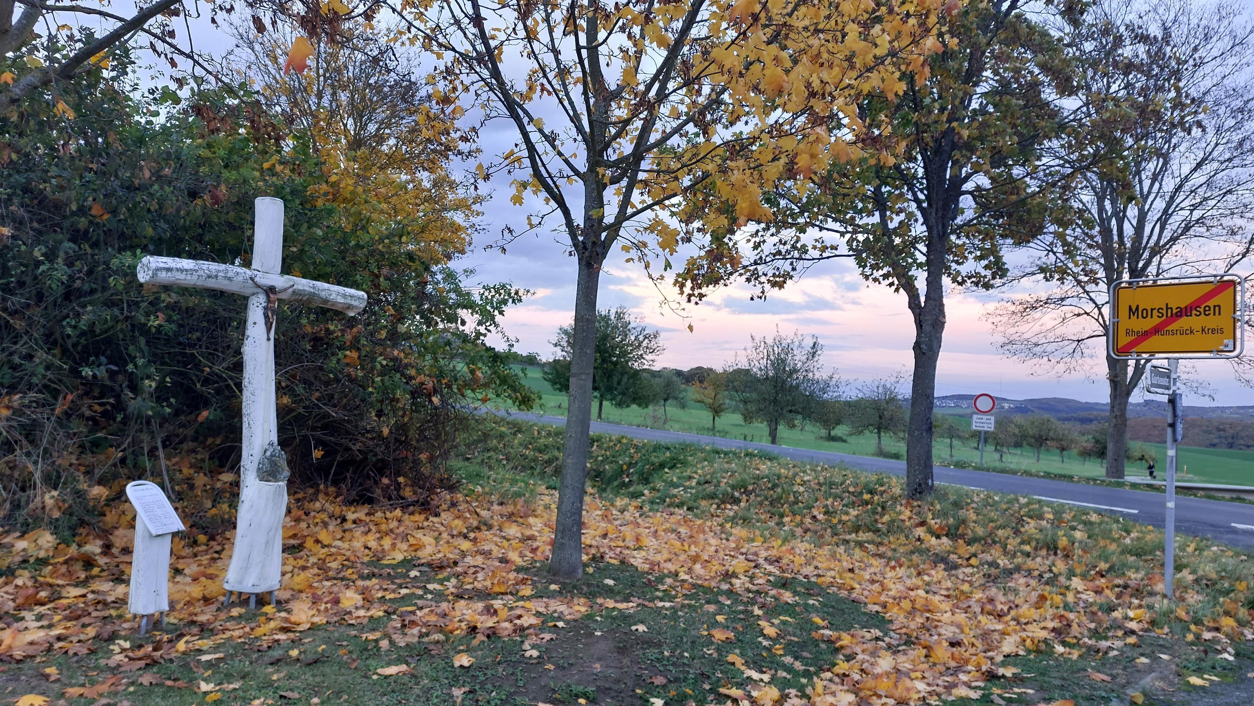 Weißes Wegkreuz am Ortseingang von Morshausen