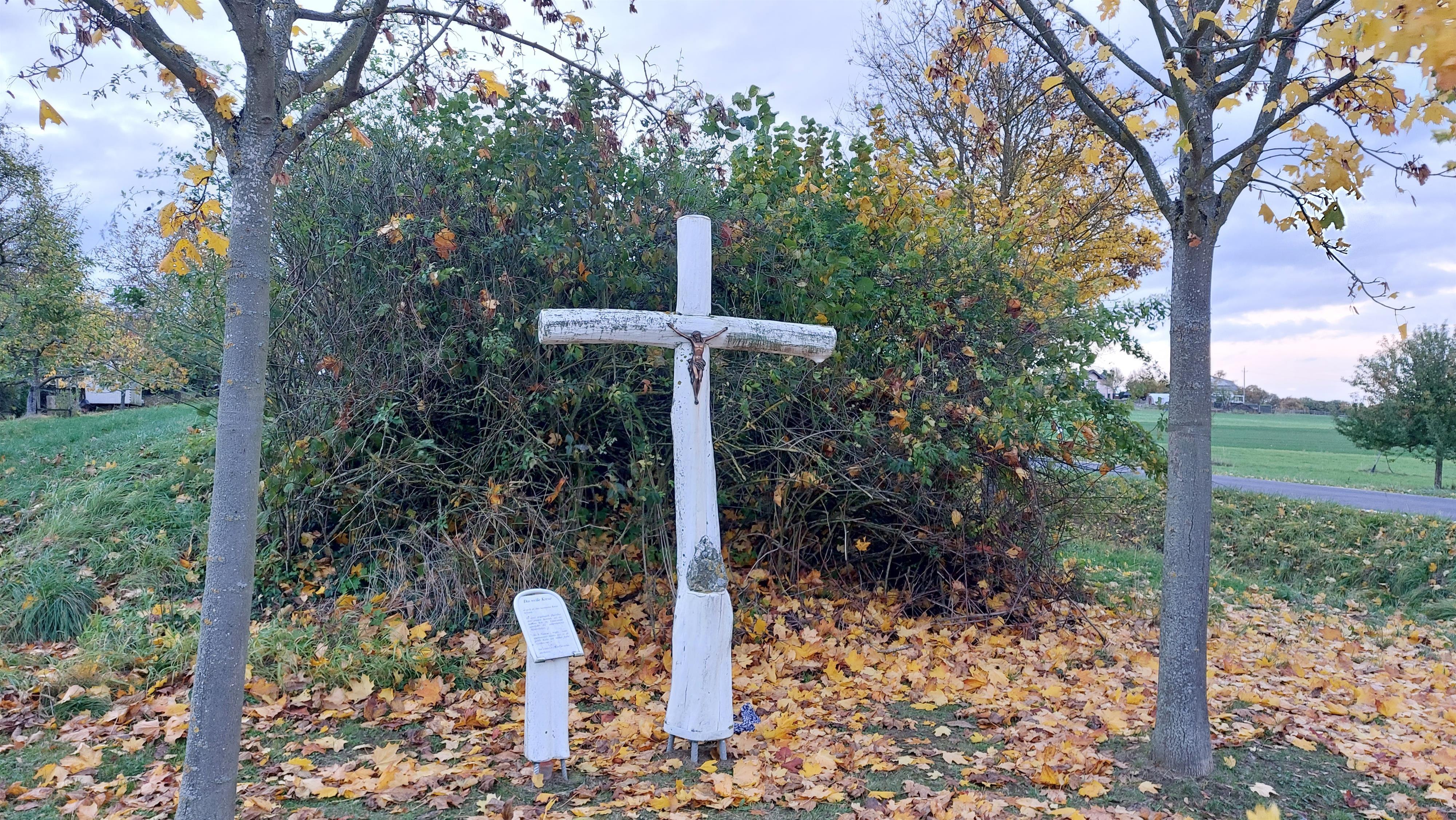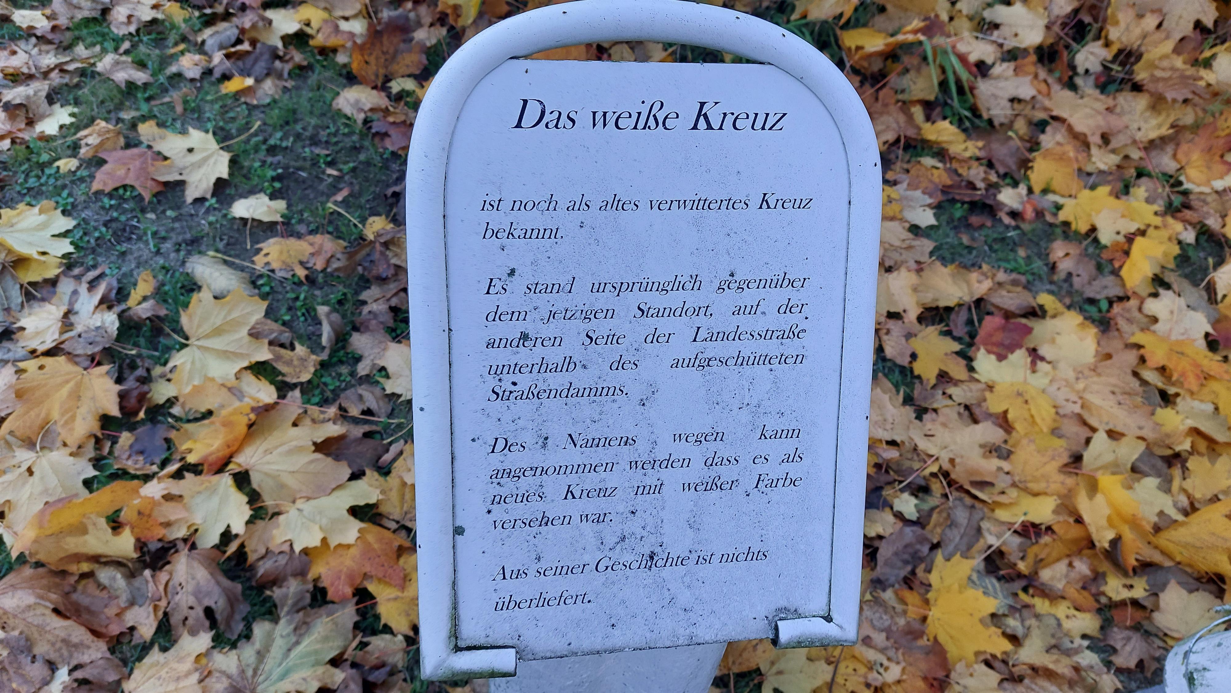 Das weiße Kreuz ist noch als altes verwittertes Kreuz bekannt. Es stand ursprünglich gegenüber dem jetzigen Standort in der Gartenstraße, auf der anderen Seite der Landesstraße, unterhalb des aufgeschütteten Straßendamms. Des Namens wegen kann angenommen werden, dass es als neues Kreuz mit weißer Farbe versehen war. Aus seiner Geschichte ist nichts überliefert.