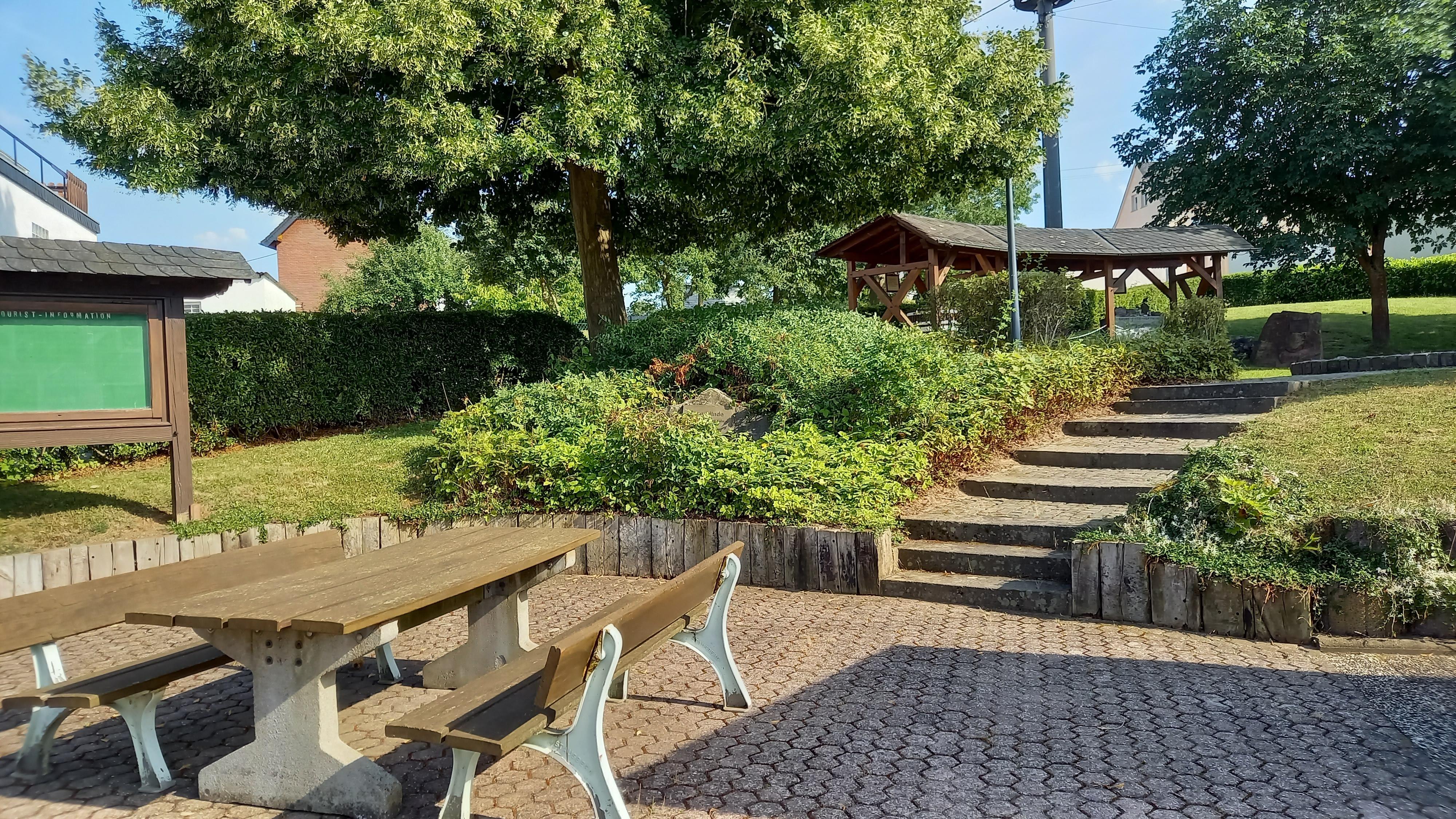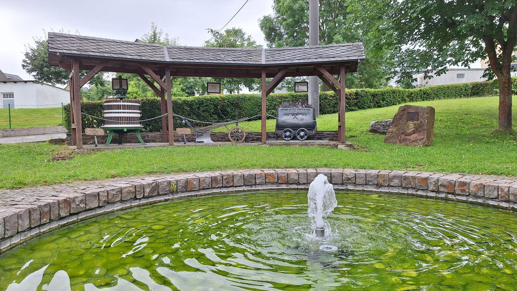 Gemütlicher Dorfplatz mit Springbrunnen und Picknickbank.