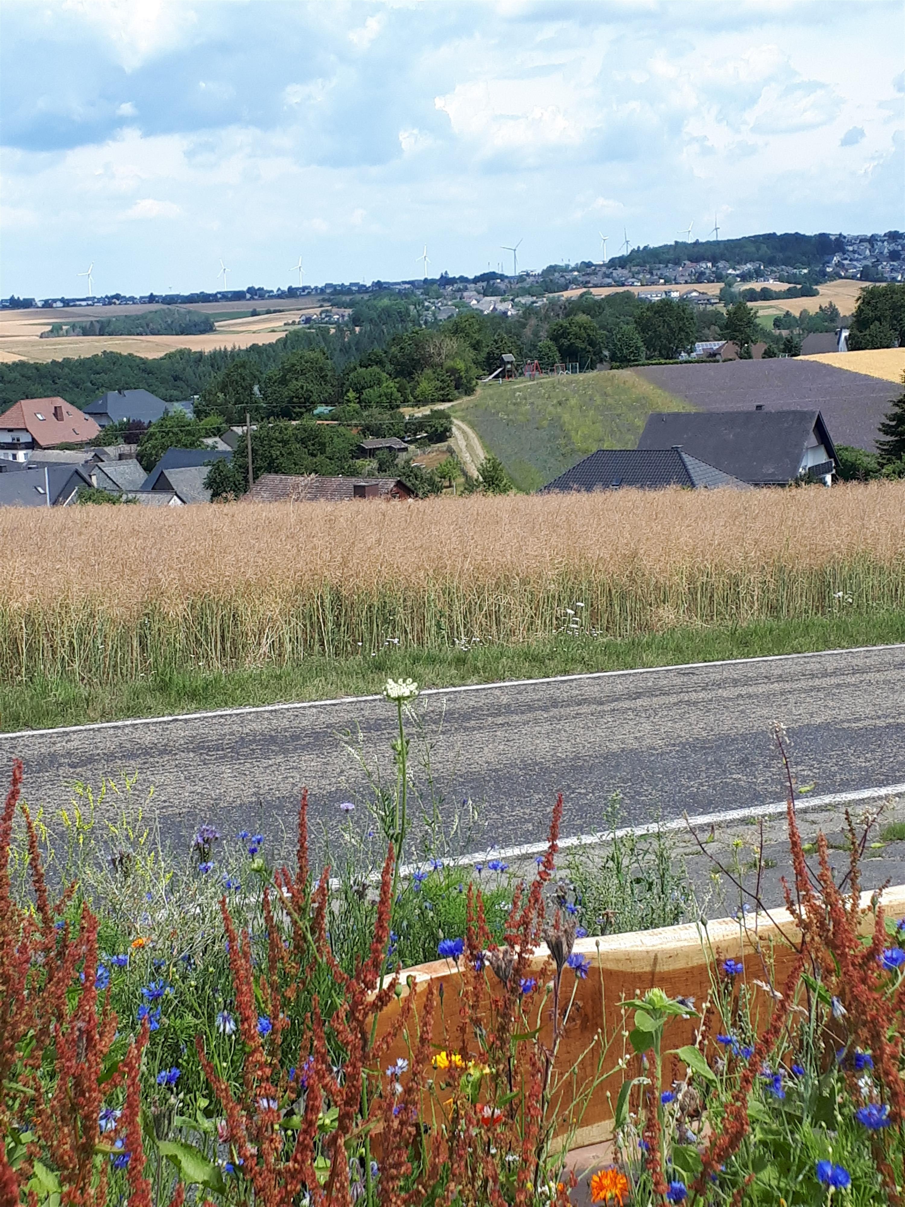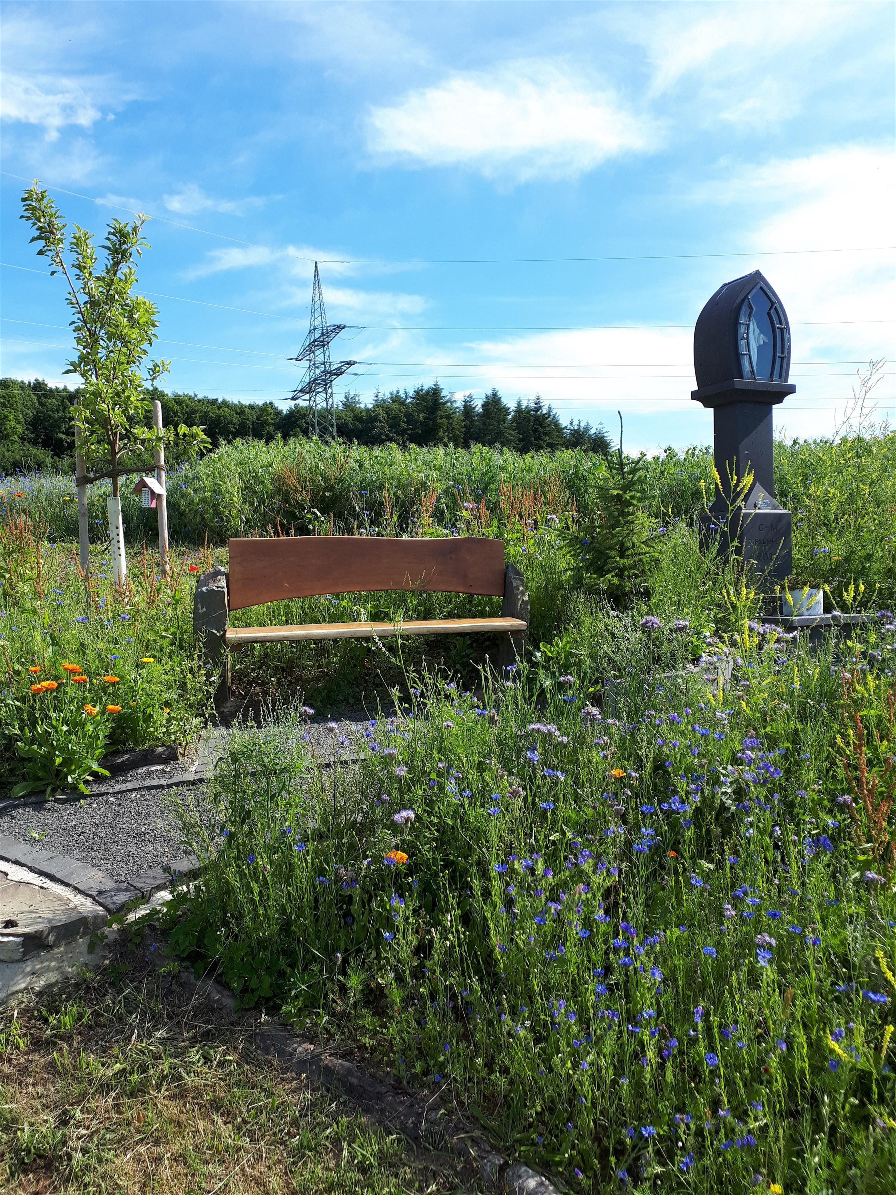 Wayside shrine with resting bench and beautiful view of the surrounding villages such as Emmelshausen, Schwall and Dörth. The wayside shrine was erected by Maria and Günter Liesenfeld from Thörlingen and is also lovingly maintained by them.