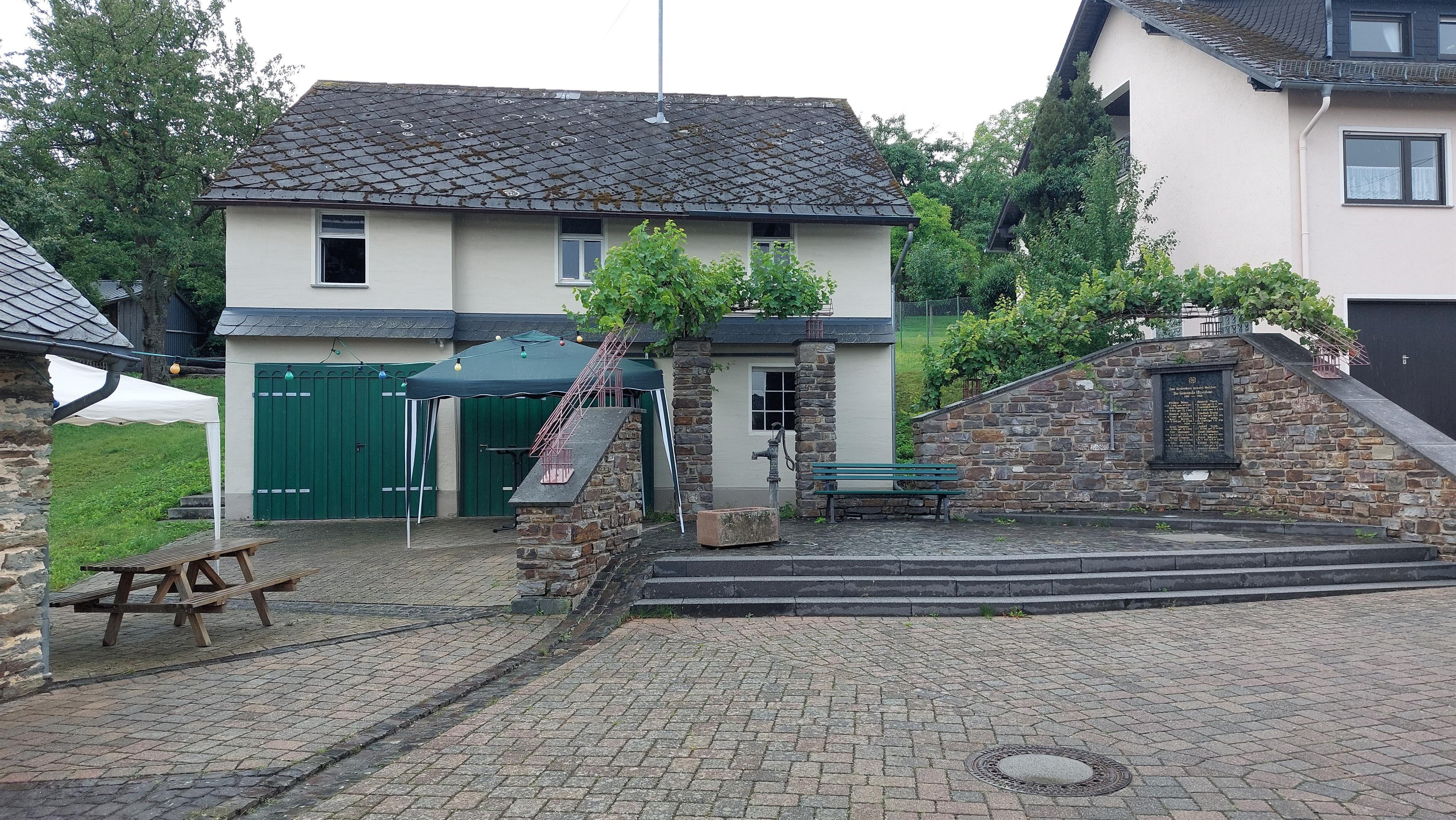 Village square in Utzenhain with picnic bench. At the village square is the Spritzenhausen from 1840 and a war memorial.