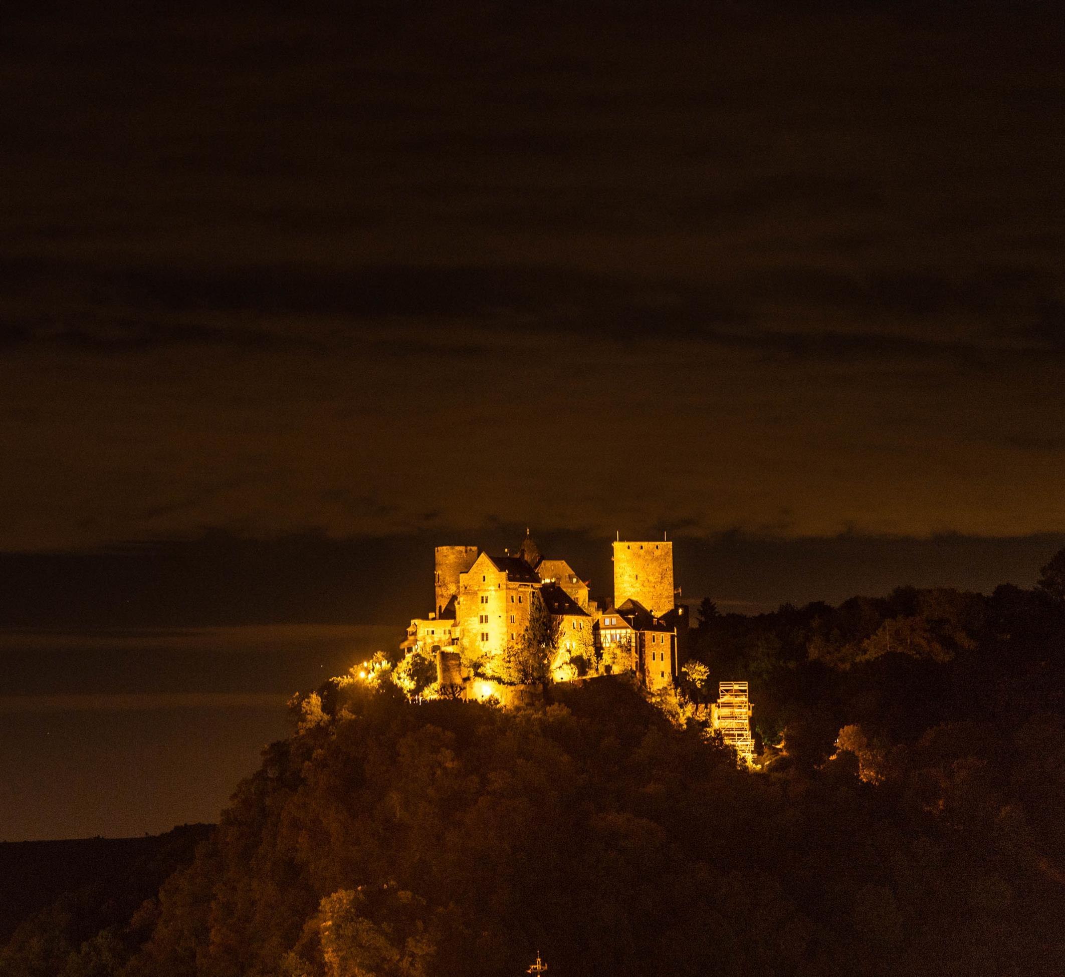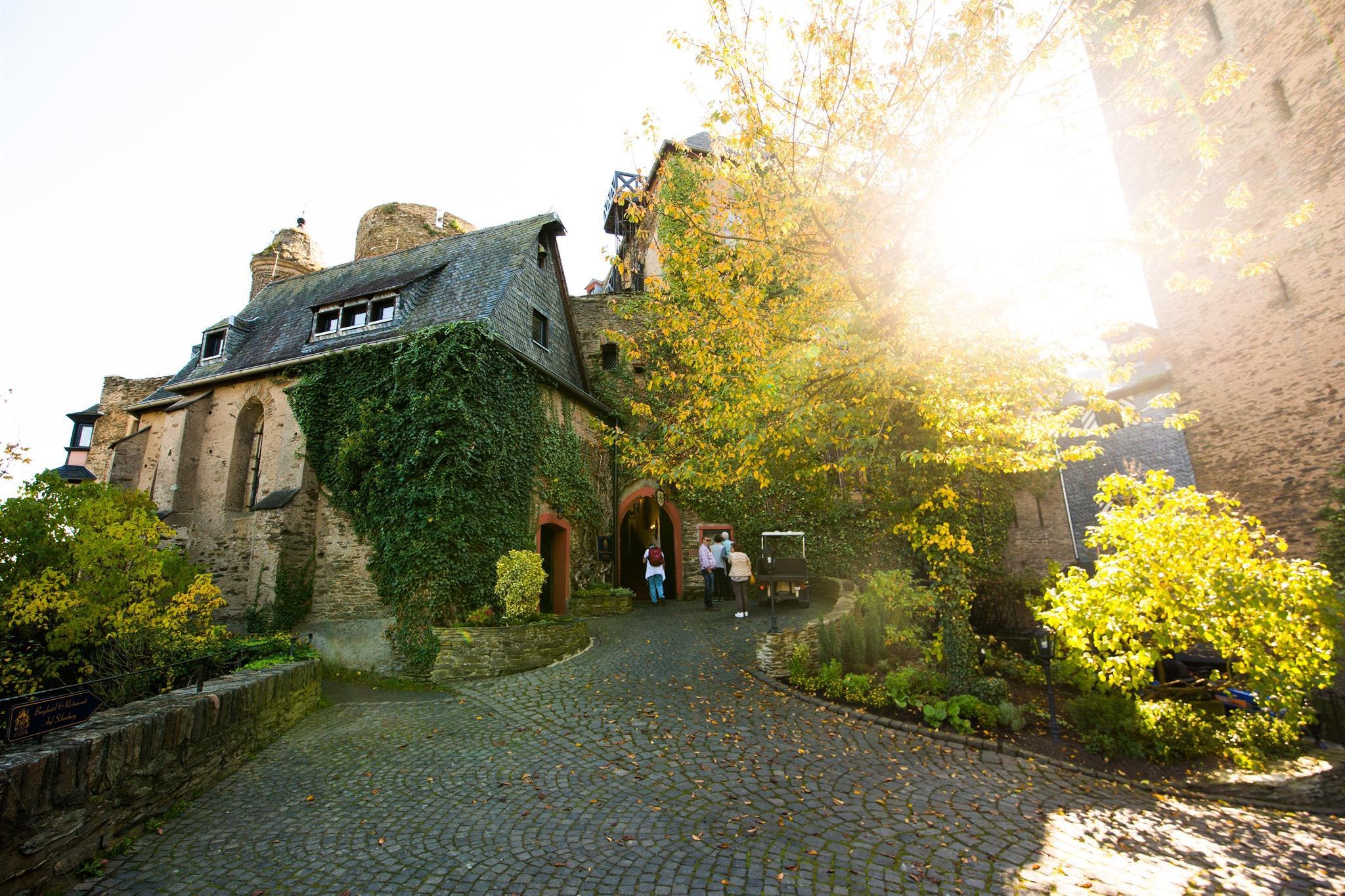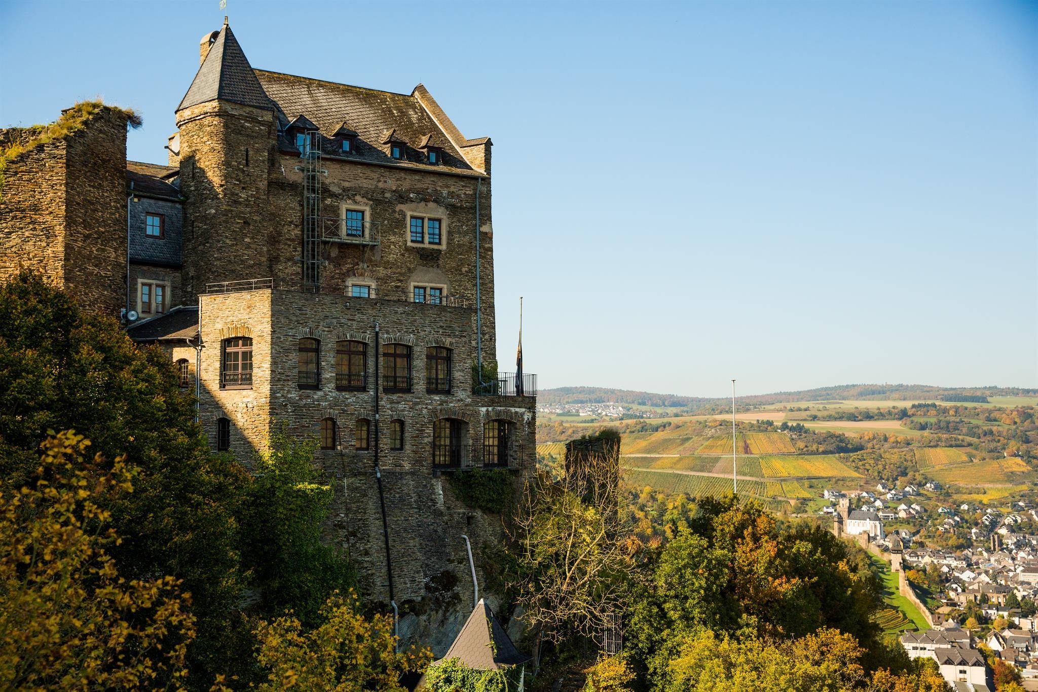 It was built in the first half of the 12th century, probably by Count Palatine Hermann von Stahleck. Later the Archbishops of Trier expanded the defensive fortifications of the consolidated castle group. Among other things, the over 20-metre high shield wall as well as the extensive zwingers were constructed during this time. Despite structural interventions during the 20th century, Schönburg Castle still has a considerably sound structure, whereby the high shield wall is what stands out. Today, the complex holds a hotel with a restaurant, a Kolpinghaus (journeymen’s inn) as well as the Torturm-Museum (Gate Tower Museum). Hikers can reach Schönburg Castle via the RheinBurgenWeg trail.