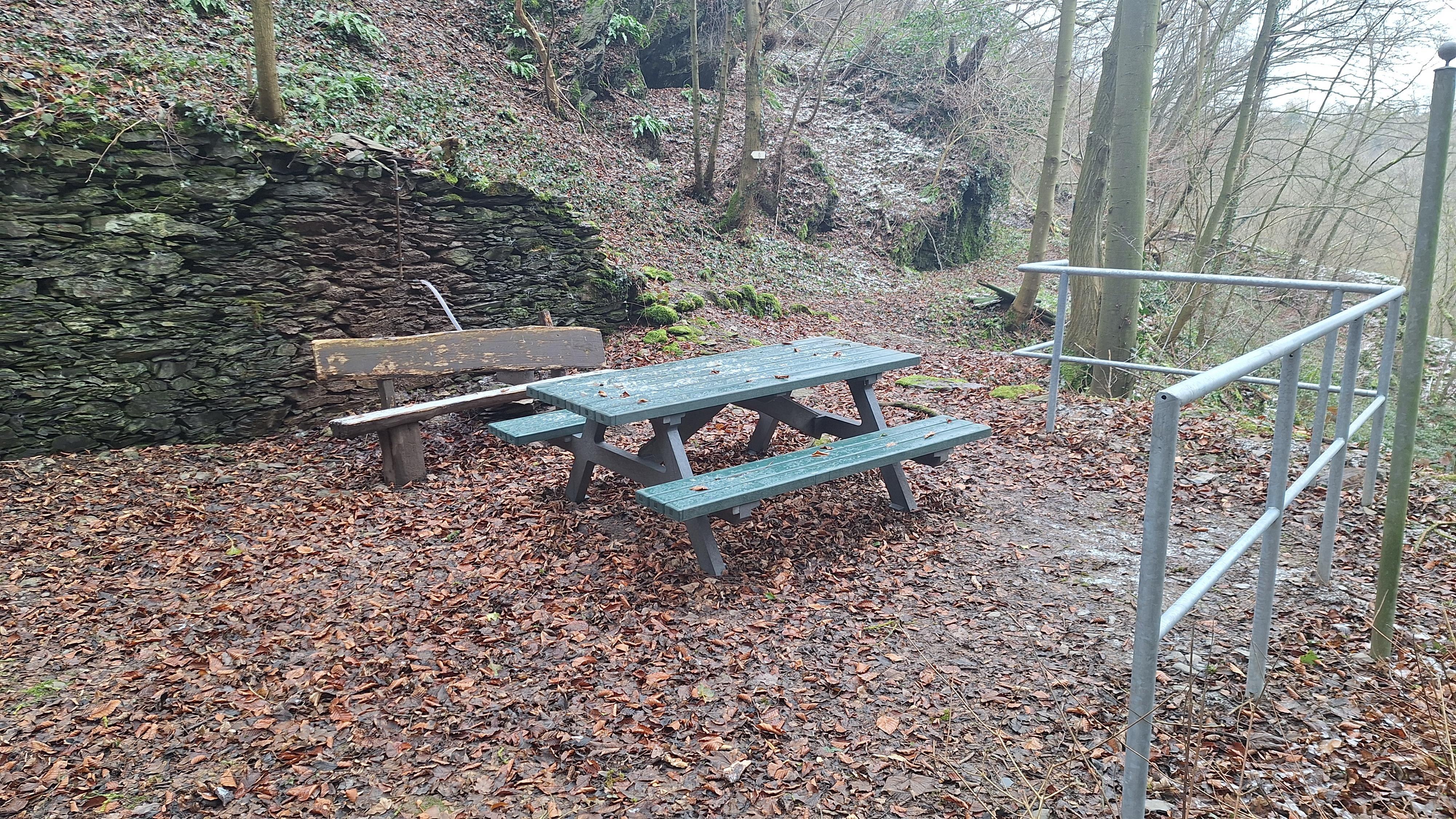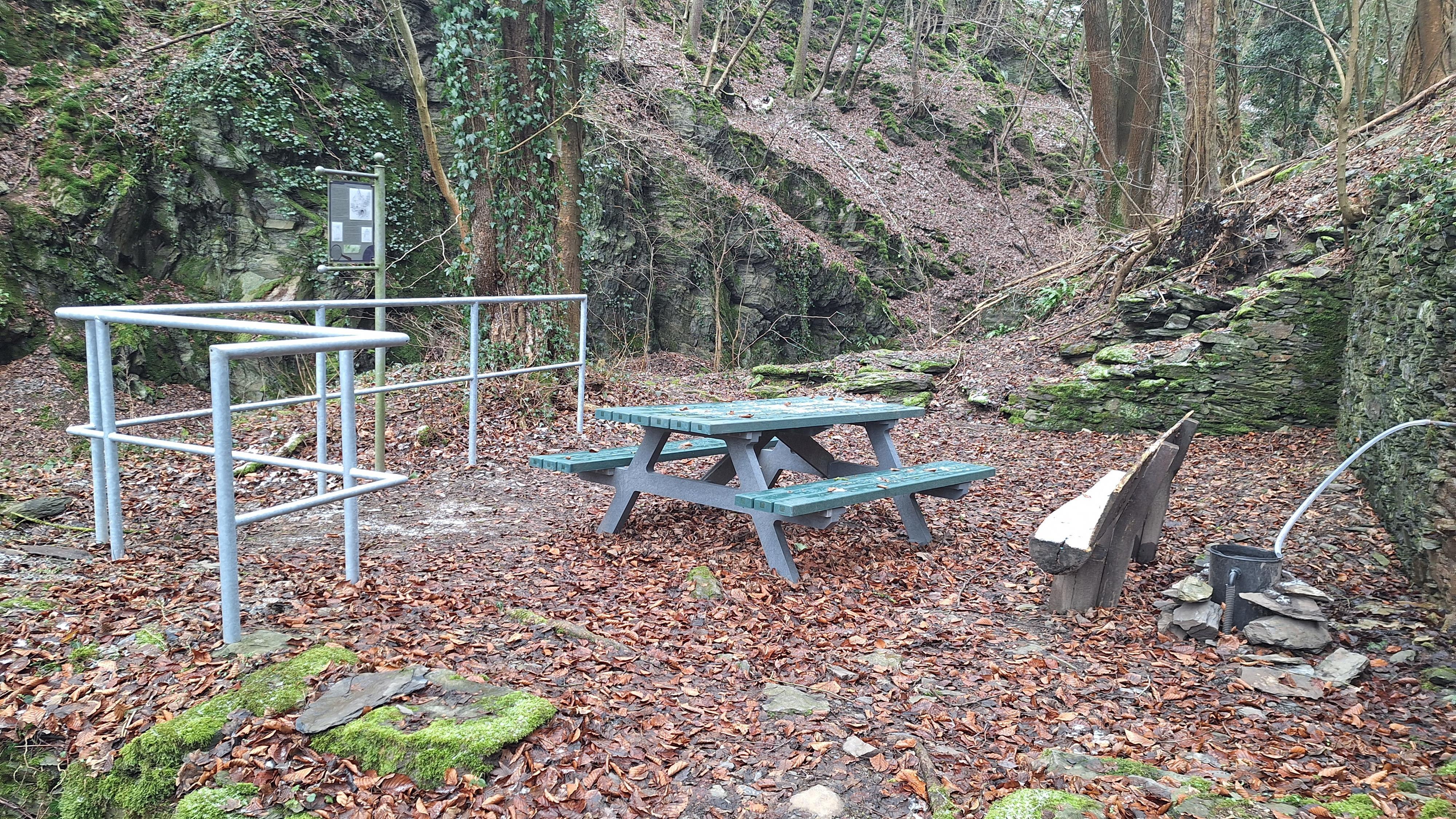 Oude molenruïne aan het wandelpad Traumschleifchen "Werlauer-Pilz" in het Heimbachtal met picknickbank.