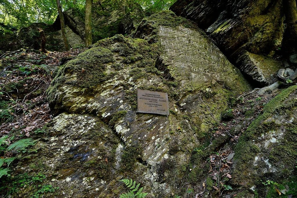 Rots in de Ehrbachklamm met gedenkplaat.