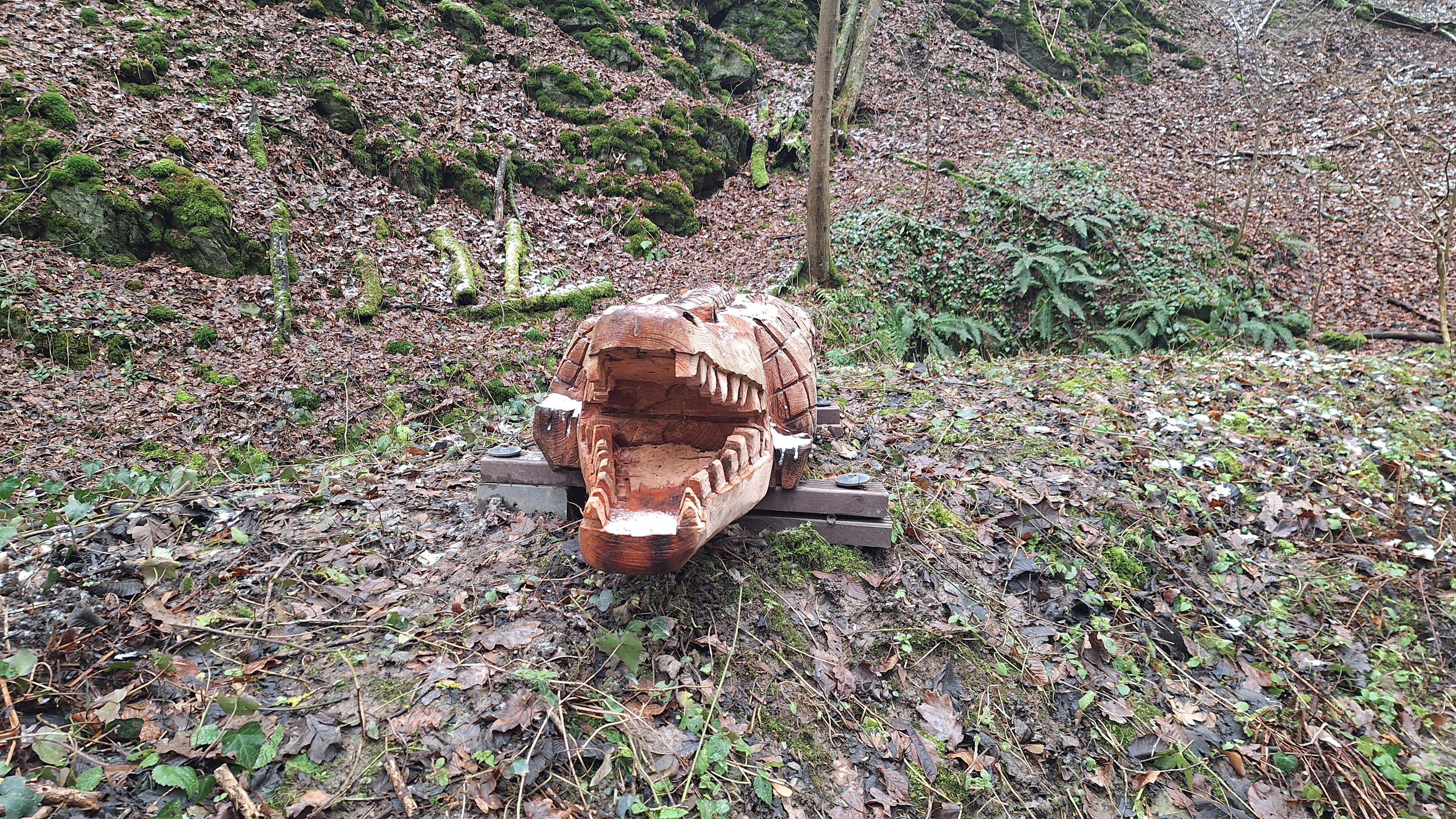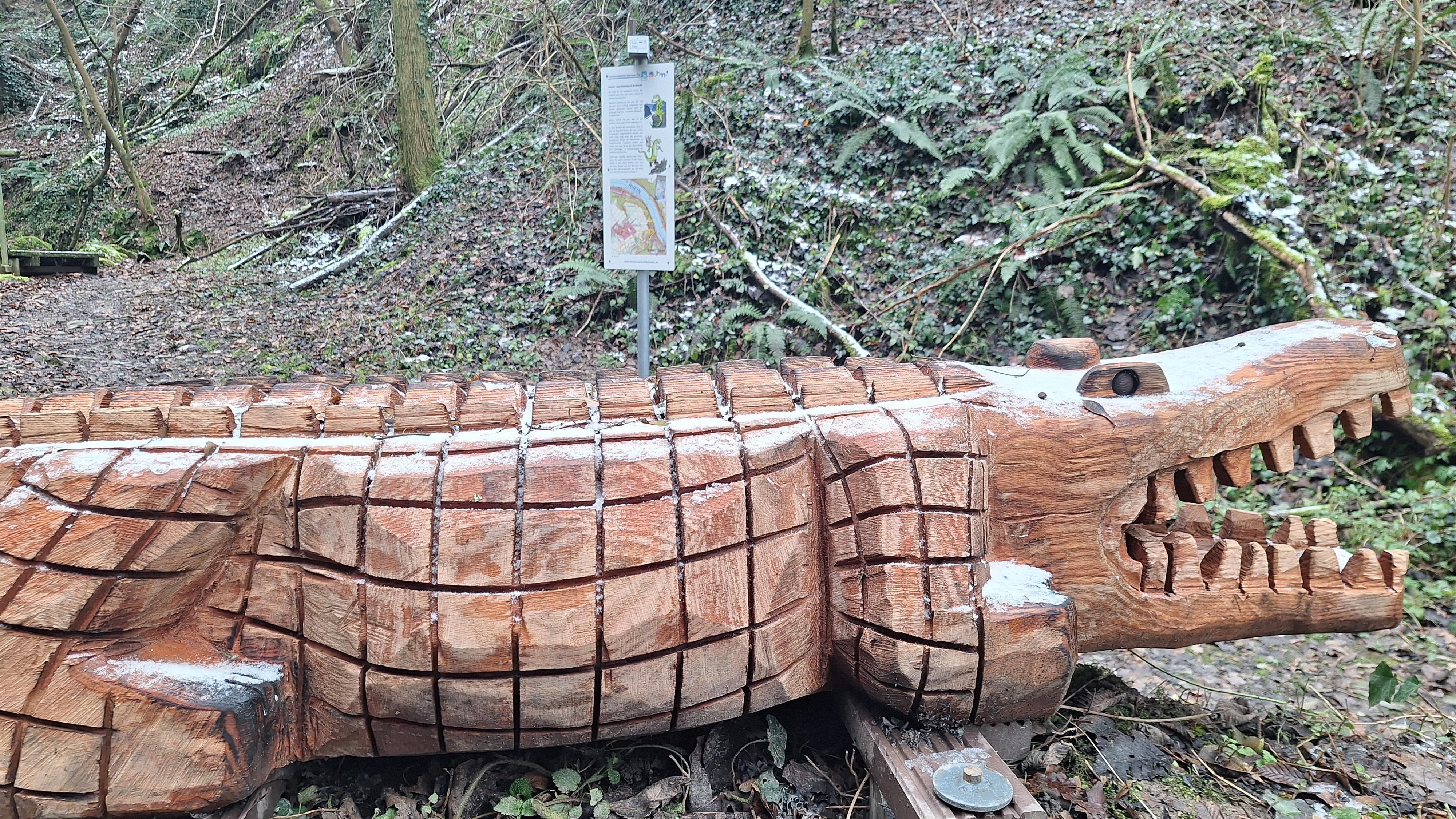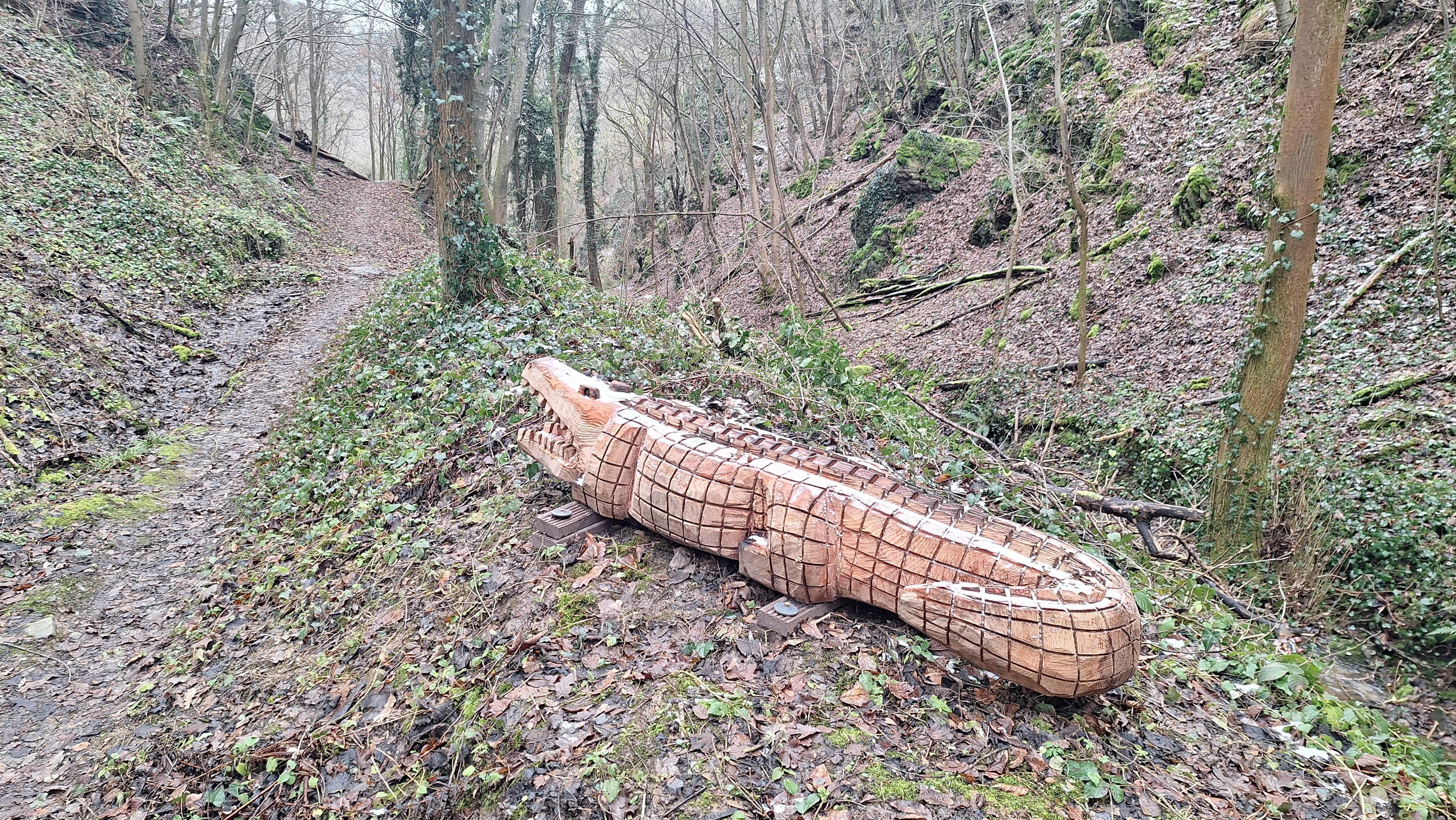 Houten krokodil aan het Droomlintje "Werlauer-Paddenstoel" in het Heimbachtal.