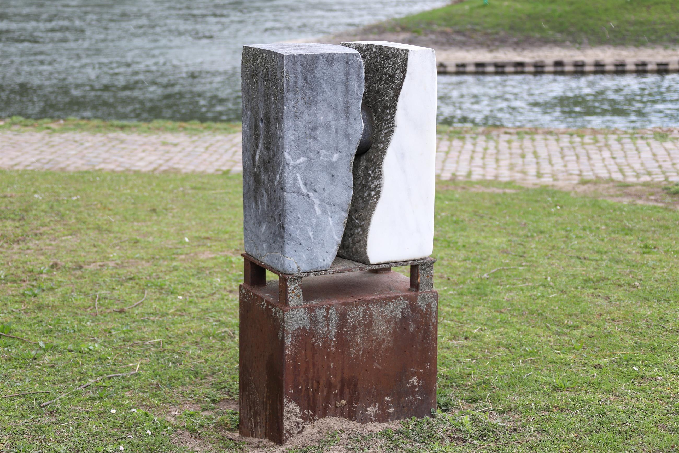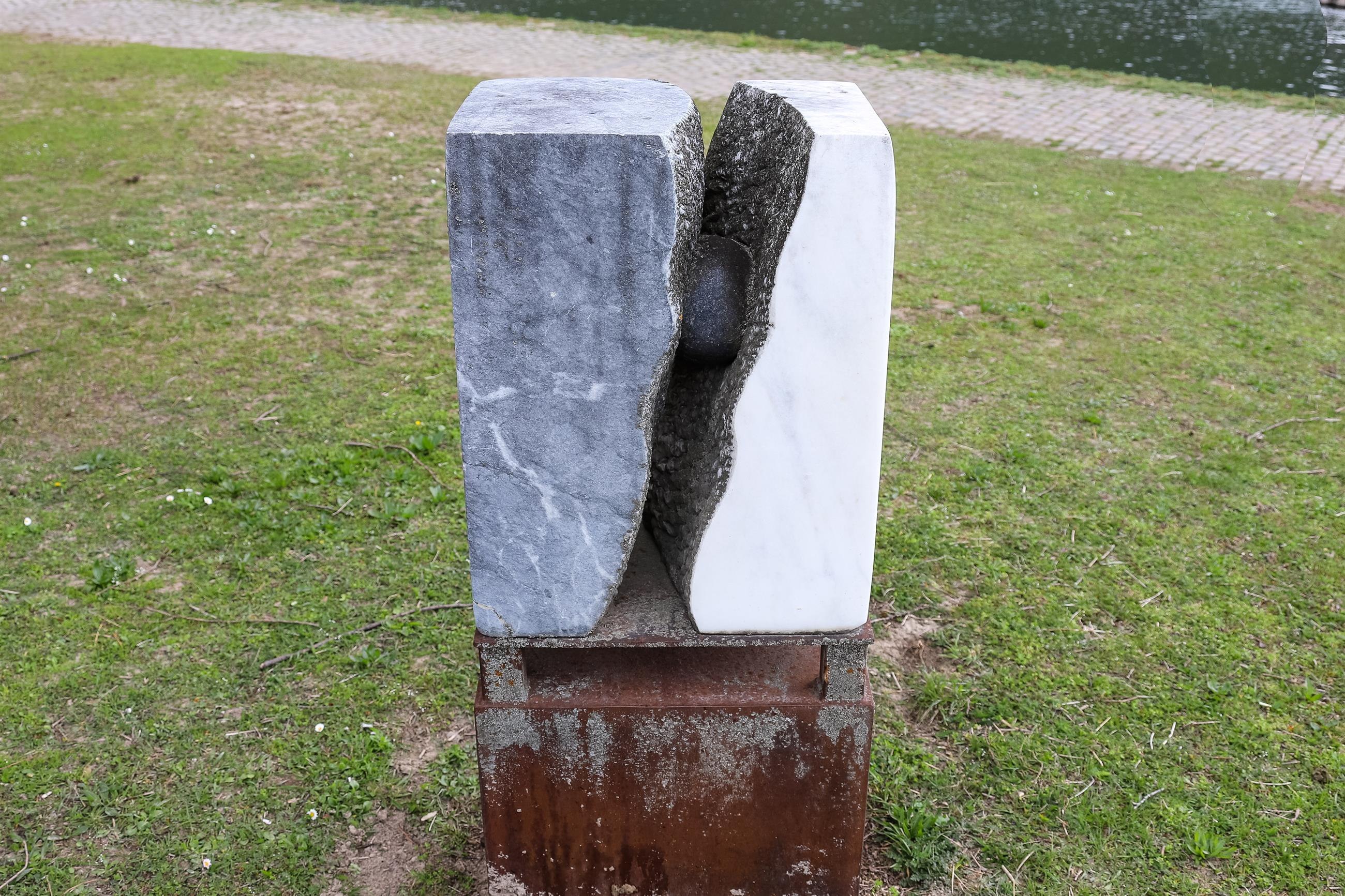 Geïnspireerd door de steen, zijn karakter en afmetingen, is dit beeldhouwwerk ontstaan in het dualisme van materiële kleuren en vormen: Strak en hoekig aan de buitenkant, zacht harmonieus gemodelleerd aan de binnenkant, dicht bij elkaar komend in concave en convexe rondingen, maar toch niet congruent. Deze spanning wordt ondersteund en geïntensiveerd door de verschillende kleuren van het marmer. De kleuren alleen al geven aan: Er zijn twee verschillende blokken steen die hier ten opzichte van elkaar staan. Het concept is duidelijk: niet één steen wordt gekapt, maar twee verschillende stenen worden samengevoegd. De vormen spreken met elkaar, waarbij elke hardheid wordt vermeden. Daarom blijven alleen de buitenkanten glad geslepen, strak gepolijst - het spanningsveld van de ruimte ertussen wordt dynamisch bewerkt. Het contrast dat hier wordt afgebeeld is in alle opzichten gelaagd: van veraf twee schijnbaar identieke delen die bij elkaar horen - en van dichtbij twee schijnbaar nog ongelijke contactvlakken. De kloof, die aan beide zijden zeer verschillend is, ondersteunt dit contrast.