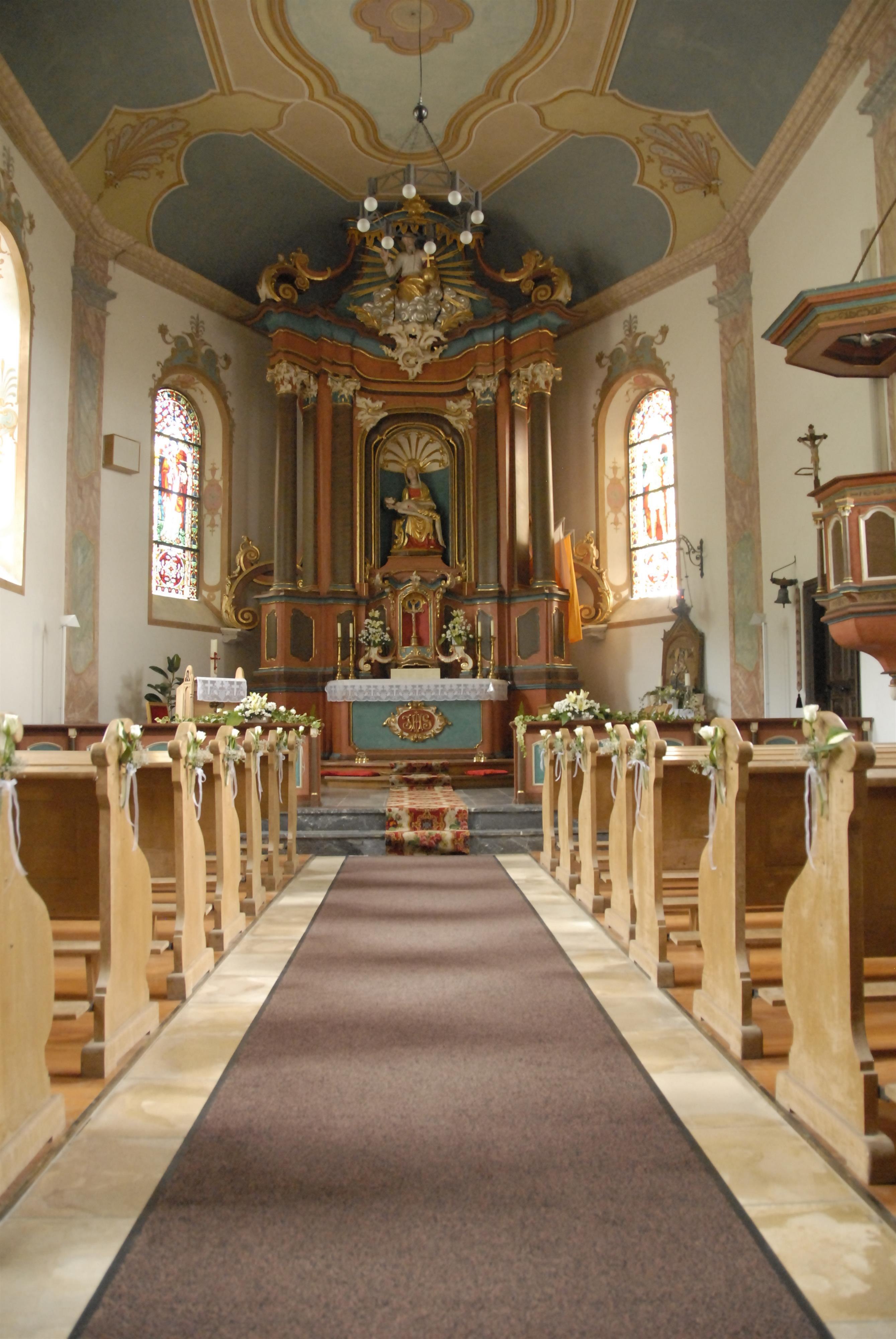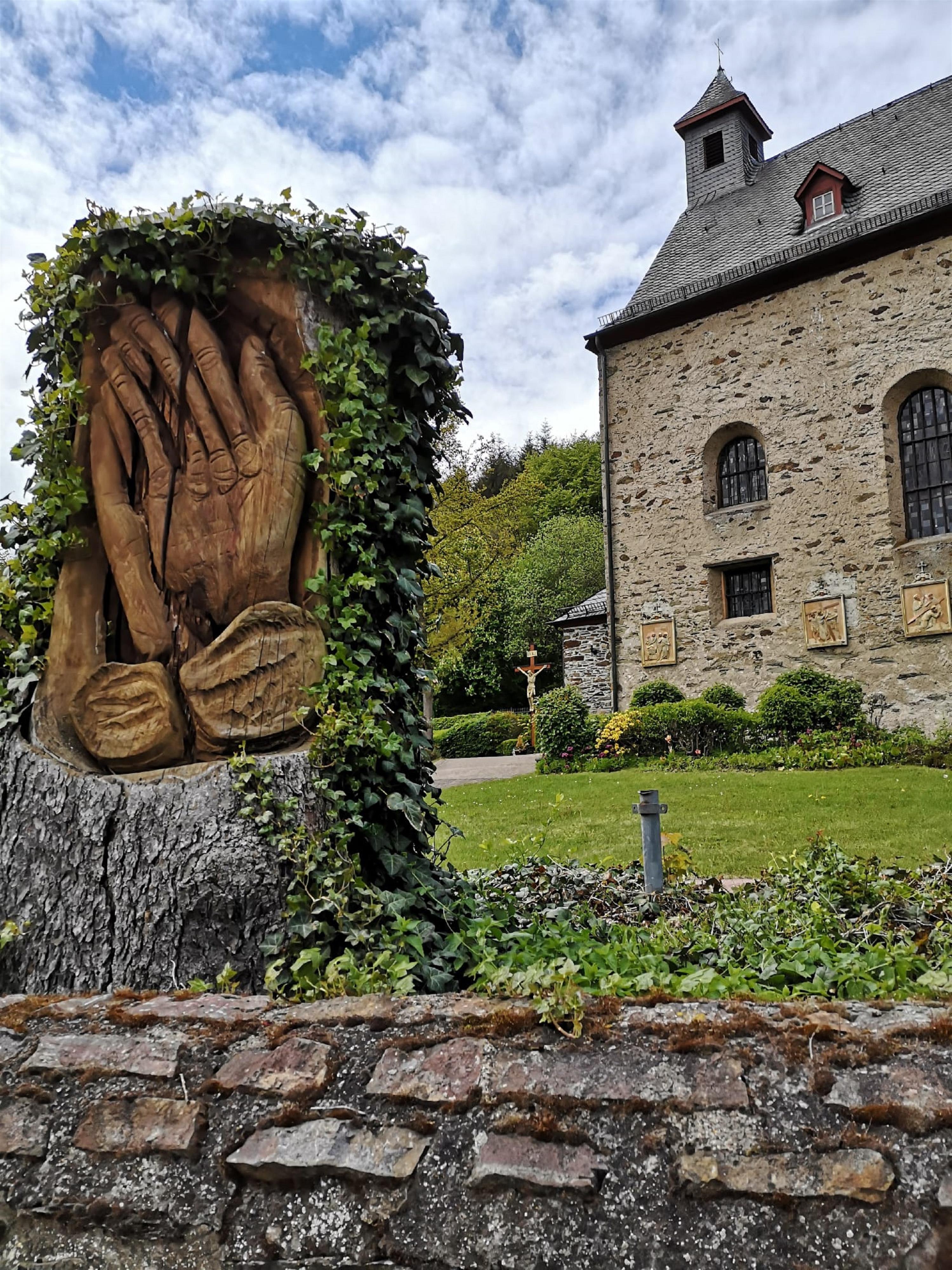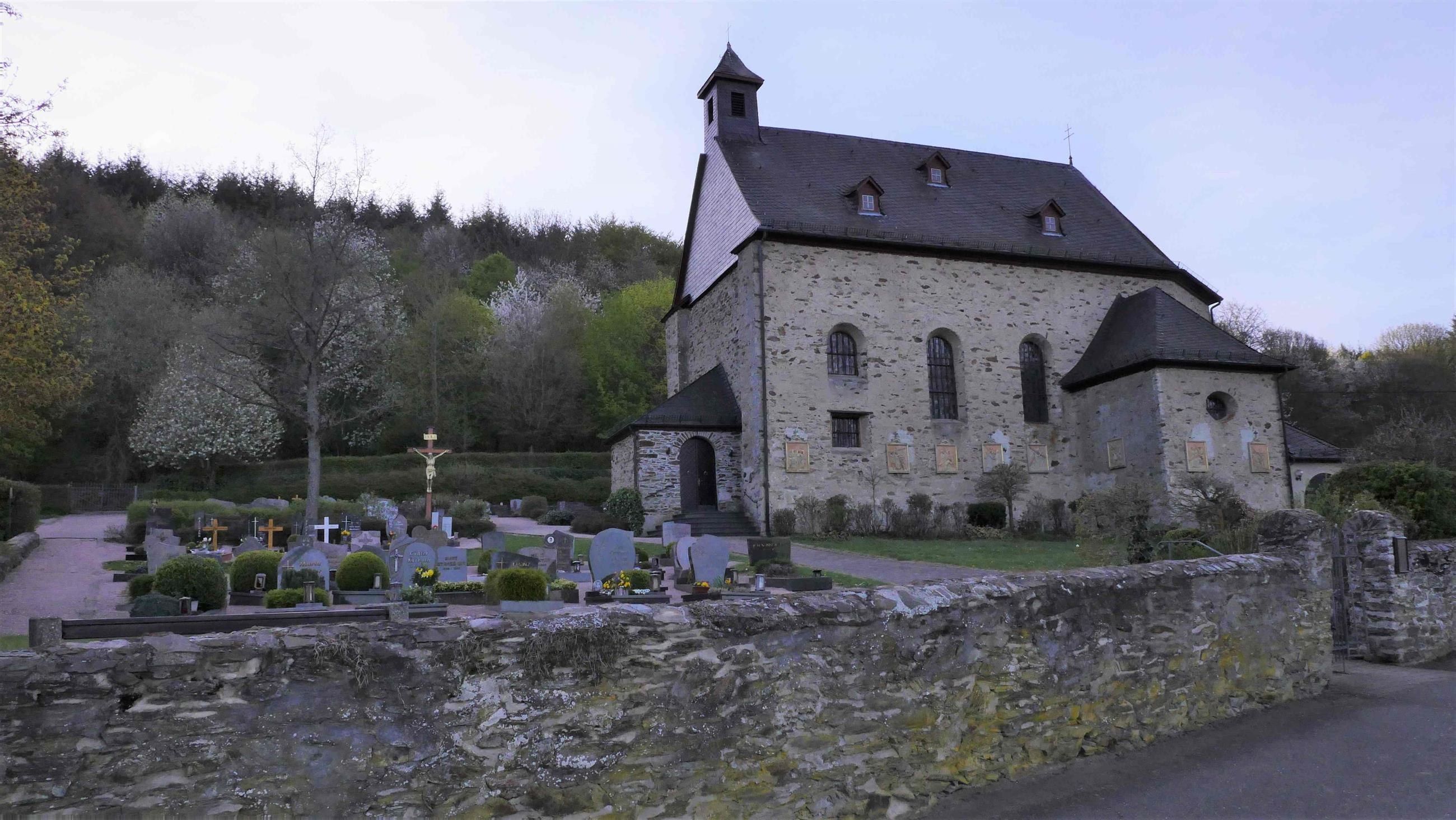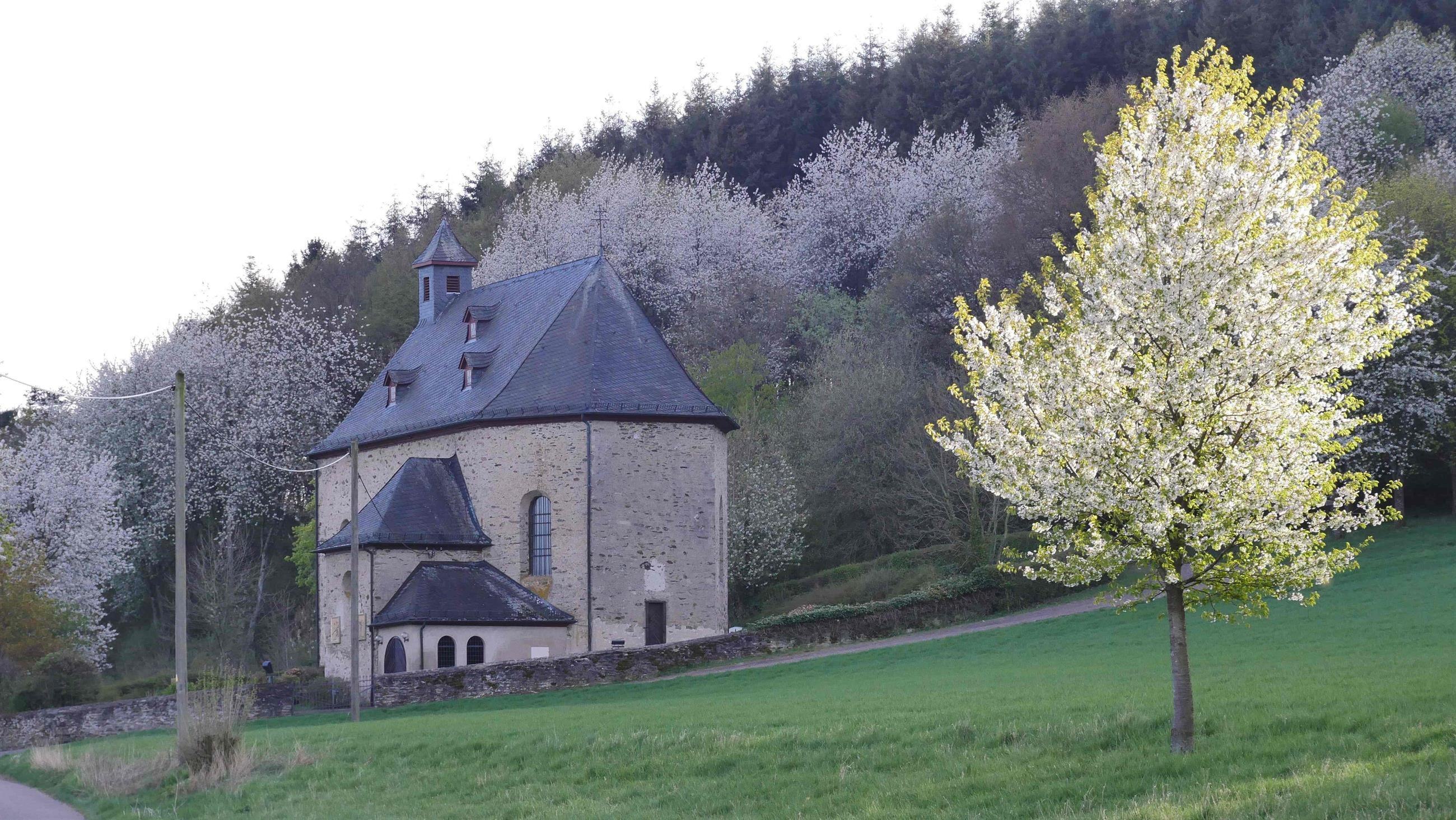 ST. QUINTIN Sint Quintin is een van de oudste kerken in Hunsrück. De oorsprong van de boerderij Quintenach, een kerk met dezelfde naam en de nederzetting Karbach (toen nog Büllingisheim of Bullingsheim geheten) gaat terug tot vóór het jaar 1000, en zou zelfs teruggaan tot de tijd van de Kelten. Voor het eerst St. Quintin werd voor het eerst genoemd in een bevestigingsdocument uit 1109 van paus Paschal II. De kleine bedevaartskerk bekoort door haar ongewone verschijning, een prachtige ligging direct aan de rand van het bos en de bron van St. Quintin recht tegenover. Het wordt alleen gesierd door een gevelruiter in plaats van een grote klokkentoren. Het indrukwekkende barokke hoogaltaar, het fresco van het Laatste Avondmaal en de houten figuur van St. Quintin zijn tijdens de zomermaanden op zondag te bezichtigen. Er is een legende in dit gebied dat St. Quintinus rond 800 na Christus met zijn kudde schapen door onze streek trok. Het was heet en de valleien en hoogtes zaten zonder water. St. Quintin (of Quentin zoals ook wordt geschreven) raakte de aarde aan met zijn staf en er ontsprong een heldere bron. De kerk van St. Quintin zou op deze plek gebouwd zijn. De bron borrelt nog steeds, rechts van de ingang van het kerkhof. Zelfs in de heetste zomer draagt het nog water. De legende van de gezonken klok St. Quintin's kerk had vroeger een echte toren. Maar het was in verval geraakt en de drie klokken die er hingen moesten naar elders worden verplaatst. Het verhaal gaat dat een van hen werd verkocht aan Wellmich bij St. Goarshausen voor een karrenvracht aardbeienwijn. voor een karrenvracht aardbeienwijn. De tweede ging naar de Sint-Annakerk in het centrum van Karbach. De mannen uit Karbach hadden echter weinig geluk met de derde, de grootste bel. Ze laadden het op een oude kar en wilden het naar Karbach brengen. De wegen waren toen nog niet ontwikkeld en de weilanden waren erg drassig. Omdat de klok zo zwaar was, brak onderweg een wiel en viel de klok van de wagen op het weiland. Er werd snel een ketting om zijn lichaam gelegd en er werden zeugen voor hem gespannen om hem op vaste grond te trekken. Maar het is ze niet gelukt. De volgende ochtend was de bel diep in het moeras gezonken. Het is er nooit meer uitgehaald. Het ligt er nog steeds en er wordt gezegd dat iedereen die op kerstavond rond middernacht langs deze plek komt, het kan horen rinkelen.